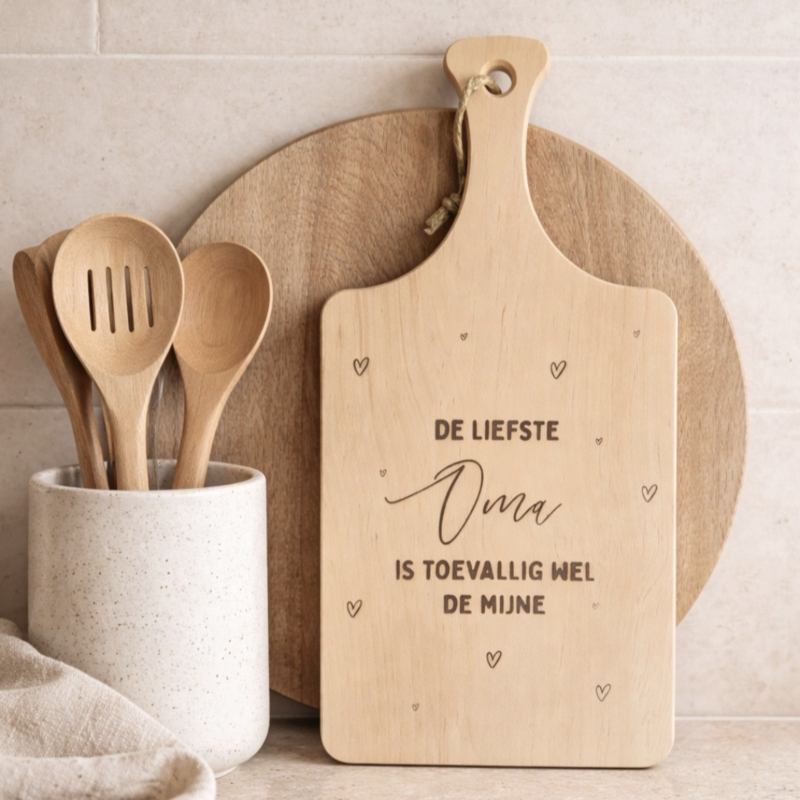 Snijplank | de liefste OmaHouten snijplank in een klassieke vorm en vervaardigd van EU geproduceerd Elzenhout. Deze snijplank heeft een handvat met een ophangkoord. Op deze snijplank brengen wij de opdruk aan door middel van een lasergravure. Deze mooie…